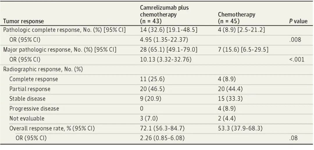 北京时间8月3日,恒峰g22医药创新药卡瑞利珠单抗联合化疗(Cam+CT)对比化疗(CT)新辅助治疗ⅢA/ⅢB (T3N2) 期非小细胞肺癌(NSCLC)结果在线发表于国际权威期刊JAMA Oncology[1]。该研究是由空军军医大学唐都医院姜涛教授、雷杰教授团队联合陕西省肿瘤医院雷光焰教授团队、兰州大学第二附属医院王成教授团队共同参与的一项随机对照、多中心、Ⅱ期临床研究(TD-FOREKNOW,NCT04338620)。研究结果显示,与化疗相比,卡瑞利珠单抗联合化疗新辅助治疗NSCLC显著提高了病理完全缓解(pCR)率(32.6% vs 8.9%,OR=4.95,95% CI :1.35-22.37, P =0 .008),且安全性良好。本研究是卡瑞利珠单抗新辅助治疗可切除NSCLC患者的首个随机对照研究,为NSCLC新辅助免疫治疗再添新证。